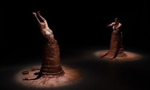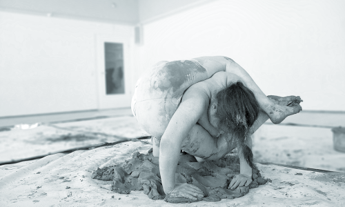 500 Kilogramm Tonerde und zwei Performerinnen lassen intime Momente entstehen, formen und verändern sich, wodurch unendliche Transformationen spürbar werden. Die Arbeit schlägt eine neue Art und Weise vor, als Menschen zu leben: im Einklang mit dem Rhythmus des Ökosystems.